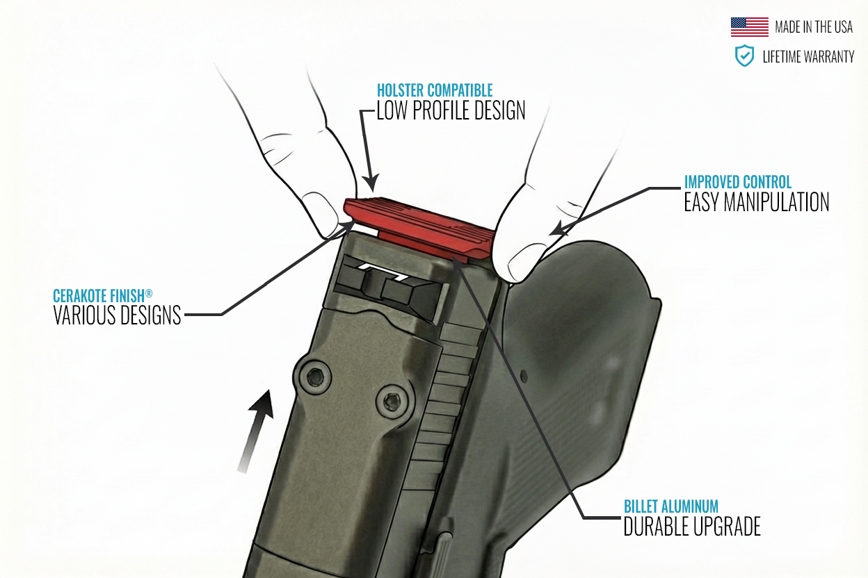 Quick Install: Direct replacement for the Glock slide end cap; typical install time < 5 minutes.